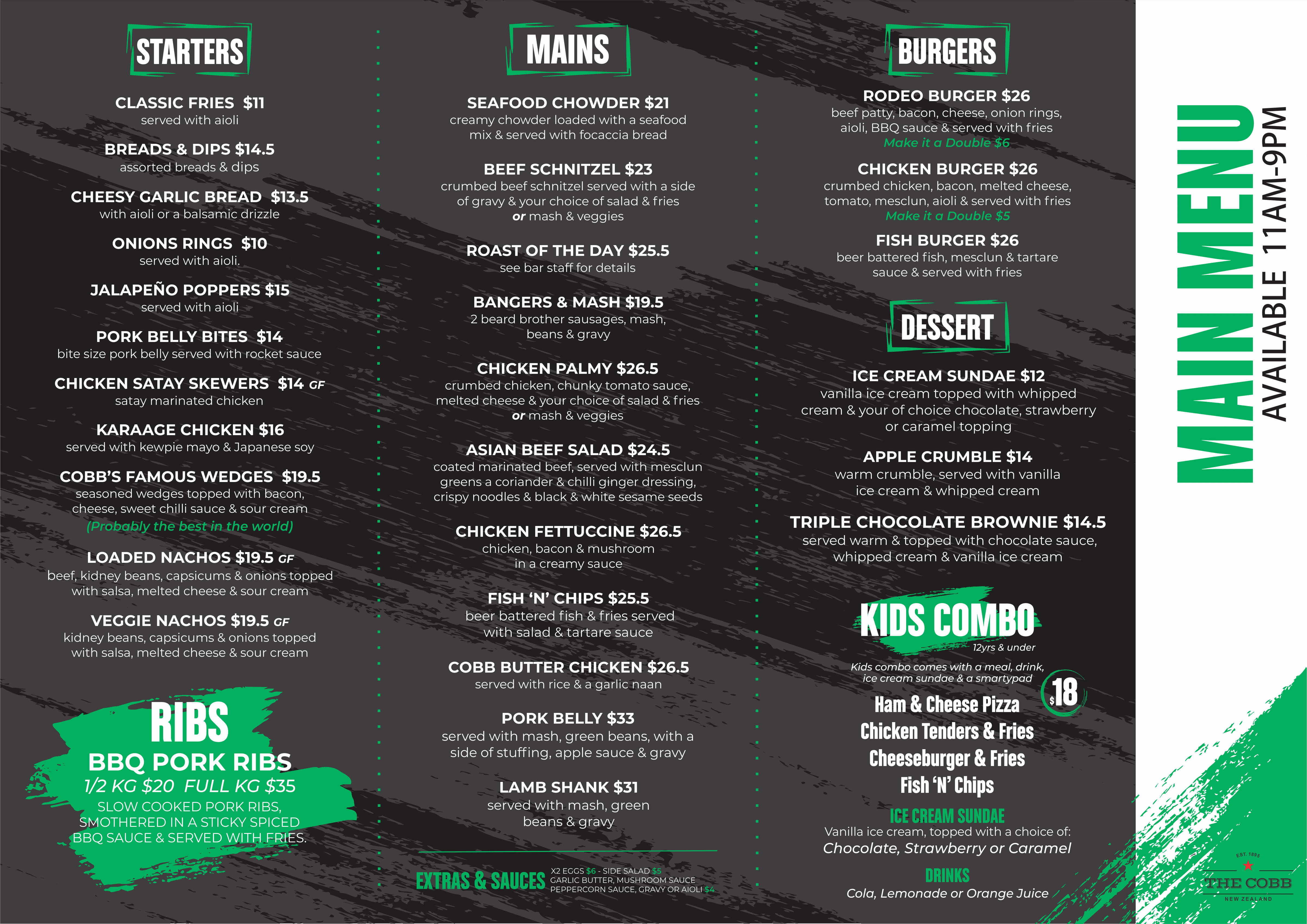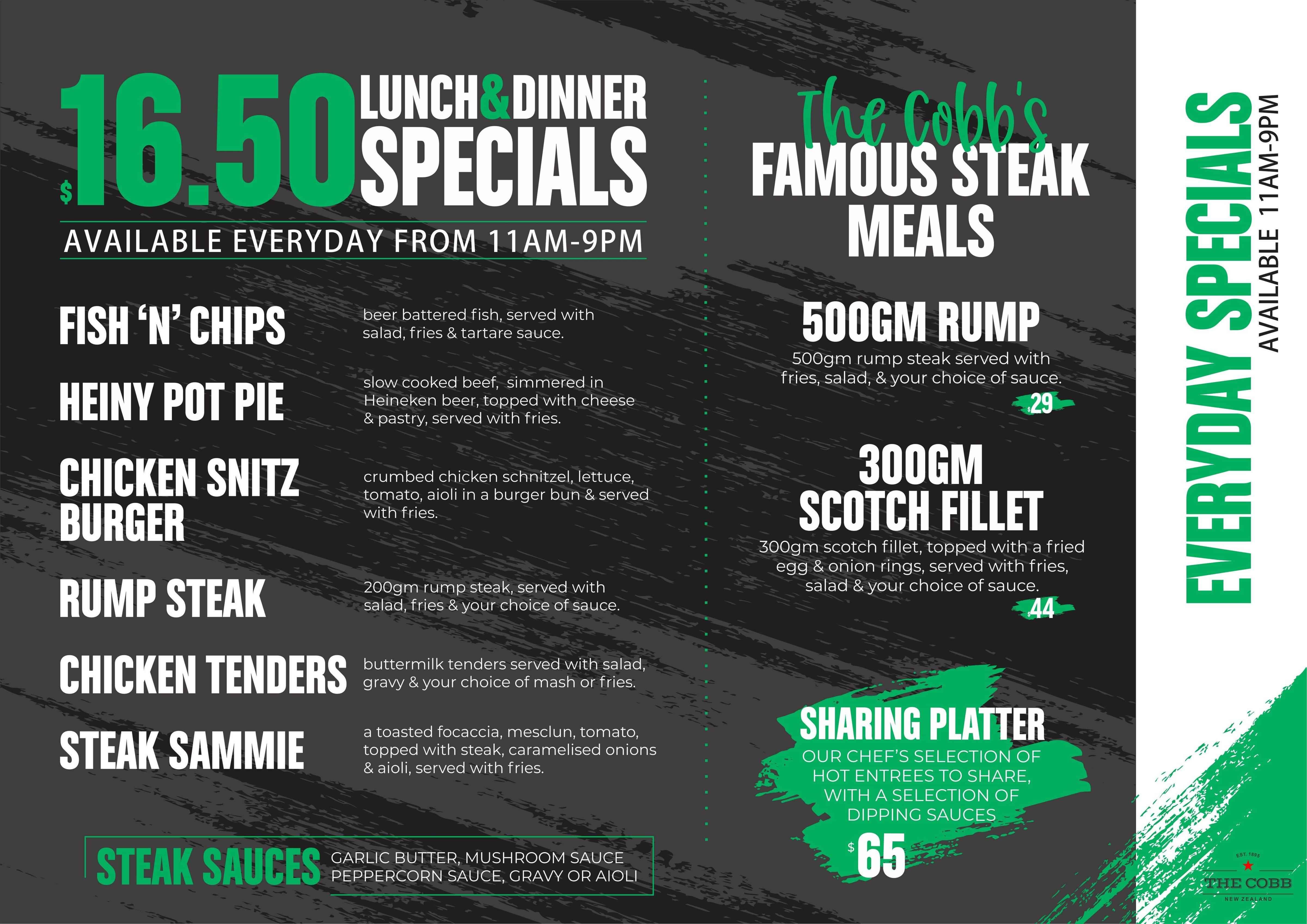 300gm scotch fillet steak served with fried egg, onion rings, salad & your choice of mushroom sauce, garlic butter or peppercorn sauce.